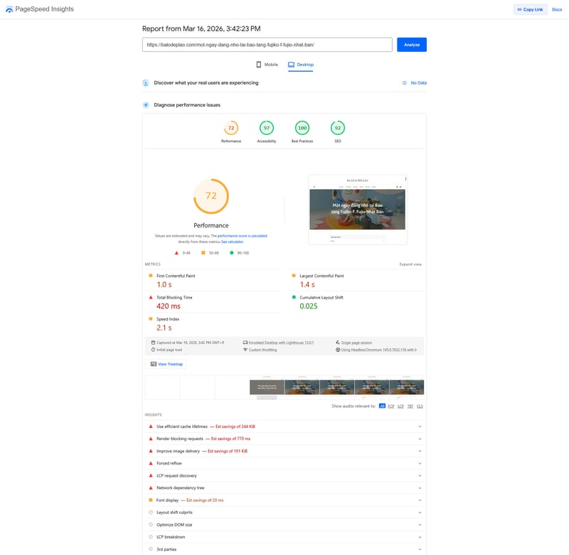 Còn dưới đây là điểm đánh giá của trang blog hiện tại đang dùng WordPress: 52 (Mobile) và 72 (Desktop), đã được tối ưu với Cache Enabler.