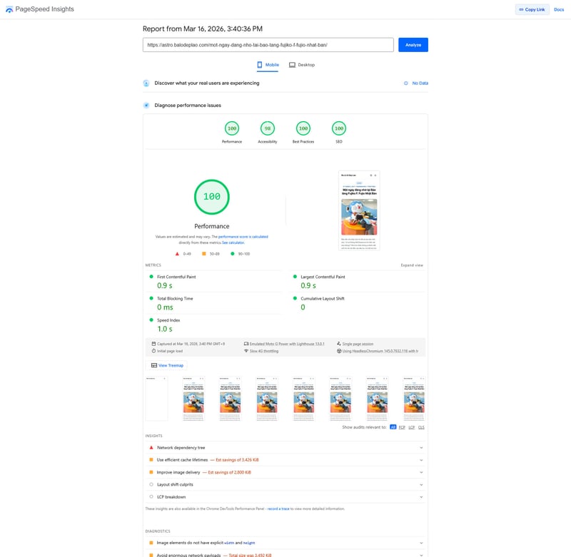 Trang bài viết lần được 100 điểm cho Mobile và 99 điểm cho Desktop, trong khi mình chưa cần phải tối ưu gì thêm.
