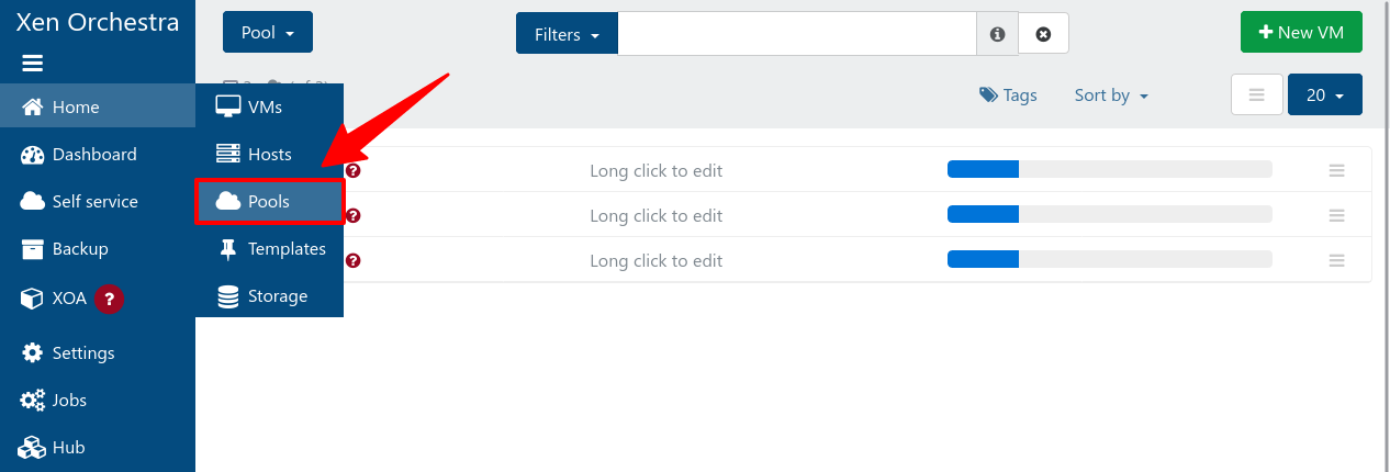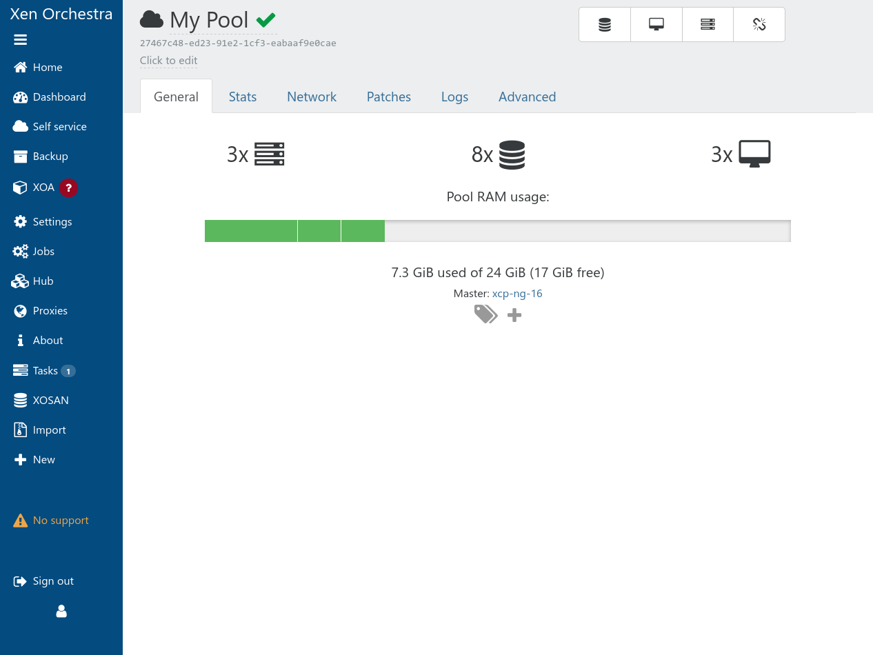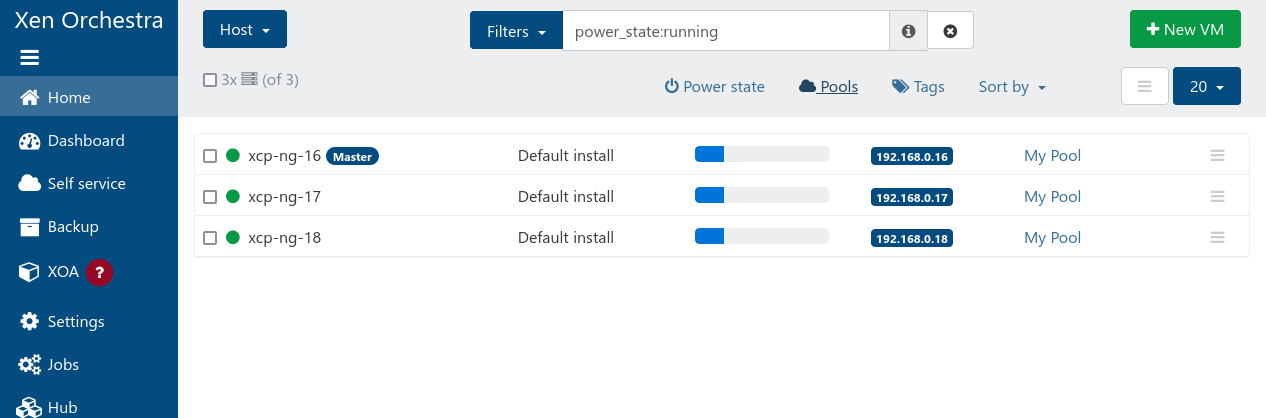 Mặc định sau khi được thêm vào Xen Orchestra, mỗi máy chủ sẽ nằm trong 1 Pool riêng với cùng tên gọi. Ví dụ: máy chủ xcp-ng-16 nằm trong pool xcp-ng-16.