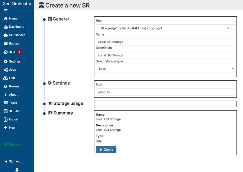 Bạn có thể chọn Local và nhập vào đường dẫn của thư mục trên Host sau đó bấm Create. Tiếp theo bạn cần truy cập vào XCP-ng thông qua SFTP hoặc SSH để tải file iso trên mạng về hoặc copy file iso từ máy khác vào thư mục đã thiết lập.