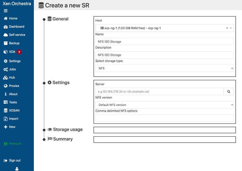 Hạn chế của việc sử dụng XCP-ng Center là bạn không thể tạo Local Storage (khu vực lưu trữ nằm trên ổ cứng của máy chủ). Bạn chỉ có thể tạo Share Storage. Do đó nếu muốn tạo Local Storage, bắt buộc bạn phải dùng Xen Orchestra hoặc gõ lệnh CLI.