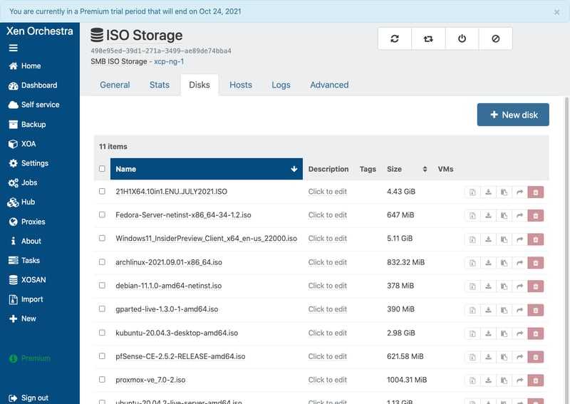 Sau khi tạo thành công ISO Storage, truy cập vào tab Disks sẽ thấy tất cả các file iso có sẵn trên thư mục shared hiện ra trên Xen Orchestra.